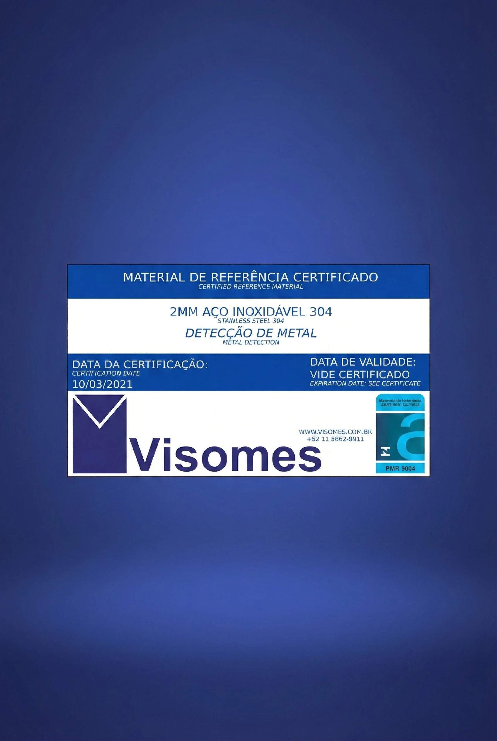 CORPO DE PROVA – ESFERA DE AÇO INOX – DIÂMETRO: 2.0 MM – FORMATO: CARTÃO 90 MM X 50 MM – CONF. PROCEDIMENTO ILV-446 LOTE: L0542 VALIDADE: 30/03/2026